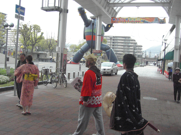 平松愛理が鉄人28号の前で